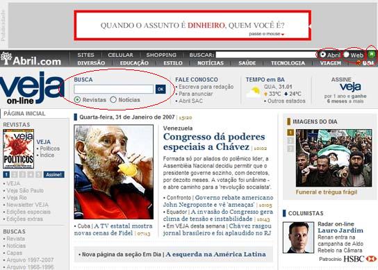 Renata, de São Paulo, mandou a página inicial do site:Eu não entendo porque alguns sites colocam opção de busca na web… se eu quiser buscar na web vou num site de busca. Se vim ao site da Veja é porque quero buscar nele, oras. E na mesma página ainda tem outra busca, também pra selecionar: revistas ou notícias? Sei lá… Pra que complicar?