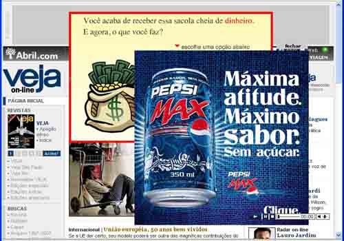 Veja no site da Veja duas propagandas poluindo a tela (de um refrigerante e de um Banco).