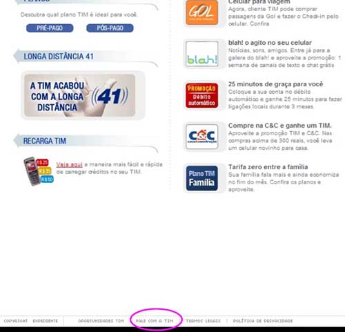 1. Acessar a página, ir até o final, procurar as letrinhas bem miúdas de “Fale com a TIM” na margem inferior da página;