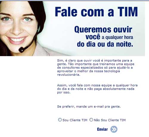 Liguei pra lá pra saber se eles só funcionam no Internet Explorer, mas a atendendente ficava respondendo “www.tim.com.br, senhora.” a cada vez que eu perguntava sobre o navegador. Na décima vez, mandou um “Como assim, senhora?”, eu tentei explicar e, notando que não ia muito adiante com ela, pedi por outra pessoa. A simpática desligou na minha cara.