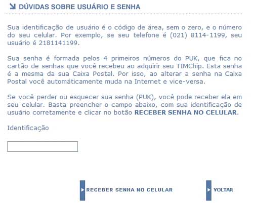 4. Chega-se a uma página de “Identificação”, que pede usuário e senha. Hein? Quem nunca entrou no site da TIM é obrigado a consultar “Dúvidas sobre usuário e senha”;